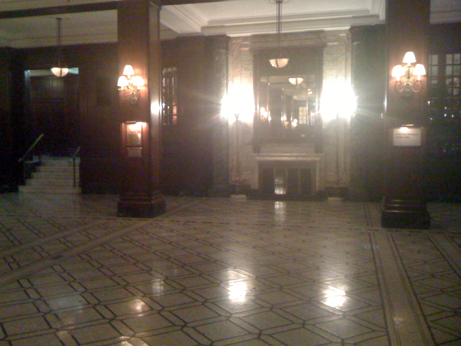 Lobby and fireplace in the Muehlebach. The SPEBSQSA plaque is on the left column.